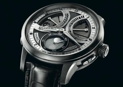 Perfekt symmetrisch sind die Gangreserve und die rückwärtigen Datumsanzeigen, die um 2 Uhr und um 10 Uhr aufgestellt sind, Spiegelbilder von einander. Die akribischen, ausgehöhlten Fenster bieten einen subtilen Blick hinter die Kulissen der Zeit; die Bögen wurden für ein "industrielles" Aussehen skelettiert, während alles unnötige Dekor vermieden wurde. Jede Hand wird mit kunterbunten Extremitäten auf das Zifferblatt aufgetragen und gleitet unter einem der zahlreichen ausgehöhlten Lichtbögen, die die Informationen der Uhr anzeigen. Die Mondphase wird auf einer präzise kalibrierten Himmelsscheibe bei 6 Uhr angezeigt. Dieses Design erfüllt den Wunsch der Marke, Zeit für ein modernes Image zu geben. Eine kleine Leuchtzeiger, die den Stunden- und Minutenzeigern sehr ähnlich ist, zeigt den Wochentag am Rande der Mondphasenscheibe an.